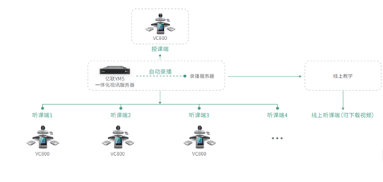 1. 系統(tǒng)整體部署多方視訊終端VC800,由YMS服務器提供支持,搭配網(wǎng)頁入會功能,實現(xiàn)高清通信體驗,同時突破不穩(wěn)定的網(wǎng)絡環(huán)境限制,保證教學過程高清流暢。